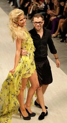 Paris Hilton displays an outfit by Ukrainian designer Andre Tan during Fashion Week in Kiev, Ukraine, Saturday, Oct. 15, 2011.